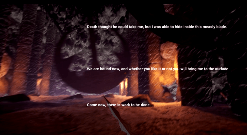 The story is told entirely by the dagger itself, which contains the spirit of a man who killed thousands so that he could live forever inside of it. He speaks directly to the thief’s mind, allowing it to boss her around or otherwise monologue. In the story my goals were to communicate the antagonistic nature of the knife, explain how the knife came to be, and on the very last level of the game offer some sort of resolution to the story. My team originally wanted to, despite our limited time, have a cutscene at the end of the game but we simply did not have enough time to do it which left the challenge of resolving the game’s story entirely on me with the dialogue system.