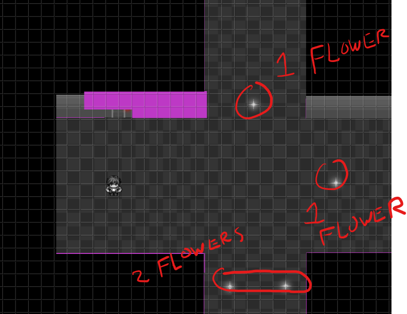 Section’s one and three were pretty straightforward. Each one is like a self enclosed labyrinth with enemies to avoid and flowers to collect. All I had to do was iterate on the layouts a bit through playtesting until I felt comfortable with the result. Section two on the other hand was kind of fun because I deliberately put ZERO lights in it for the player to collect other than the flowers. This was to make the player feel scared when the fog starts creeping in and they realize that there are basically no collectables for them to pickup and survive with. From here they must either turn back or press on to find the flower hidden here before they die.